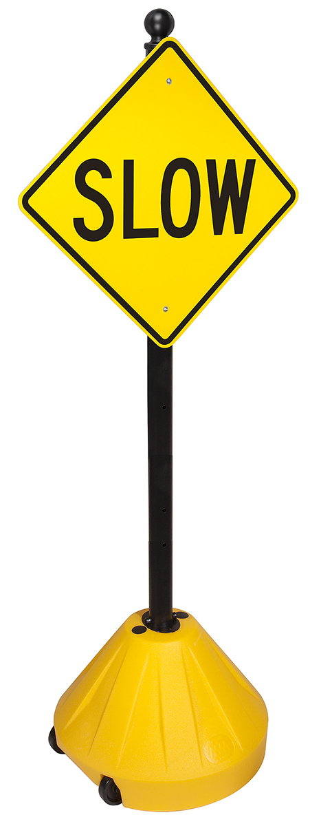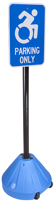 60" tall Next Generation Rolling Sign Base/Post; Universal sign holder (18" dia. x 12" tall) with large recessed 3" wheels for traffic, parking, safety signs and more; 1 or 2 sided display. Includes 2" pre-drilled pole that stands 60" high and accommodates signs from 9"x12" to 18"x24" and 12"x36". Includes exclusive EZ-GRIP Finial and Stability Plates that keep signs from twisting on post. Rolling water or sand filled base for stability and wind resistance up to 30-40mph holds up to 30+ lbs of ballast; just Grip, Tip and Roll to move in or out; user stays clean and dry. Base comes in Black, Red, Blue or Yellow.