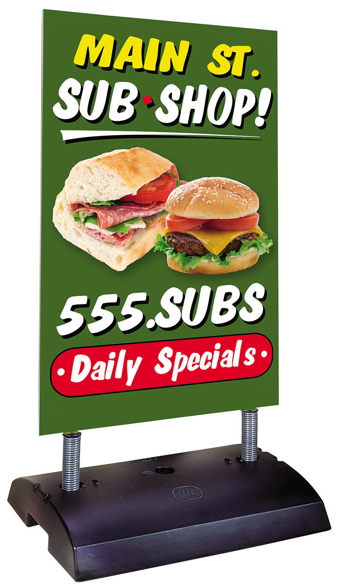 Ready4Graphic Original standard Springer sidewalk sign with blank white sign panel for custom graphics. Overall size is 24”(w)x18”(d)x46”(h). Compact size, high wind resistance, high strength technopolymer base with non-slip rubber feet and 2-galvanized heavy duty springs; 2-sided. Includes 1 - 24” x 36” x 10mm corrugated plastic white blank sign panel. Can withstand winds of up to 30mph.